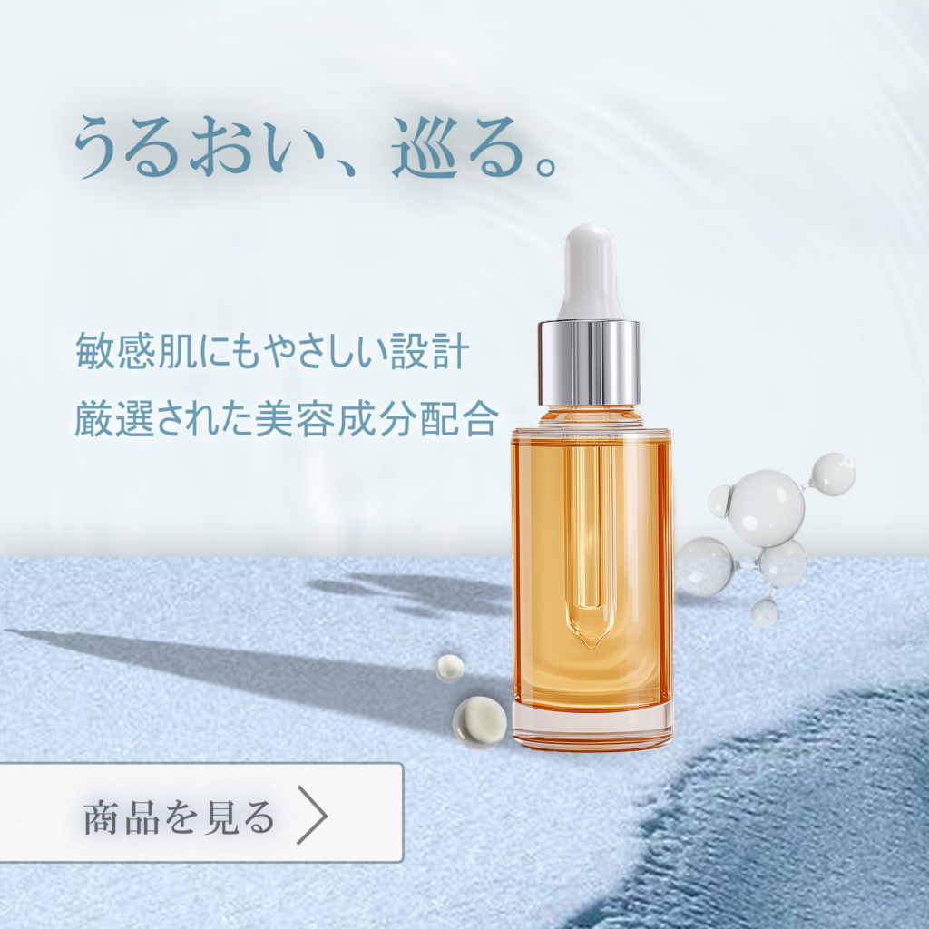 「うるおい、巡る。」というシンプルで印象に残るコピーを採用し、余白を活かして上品な世界観を演出しました。ブルーを基調とした配色で清潔感・保湿・信頼感を表現、やわらかい背景で”うるおい”のイメージを直感的に伝達することを意識しています。商品を右側に配置し、視線の流れ(コピー→商品→CTA)を意識したレイアウト設計にしています。(Photoshopで作成)